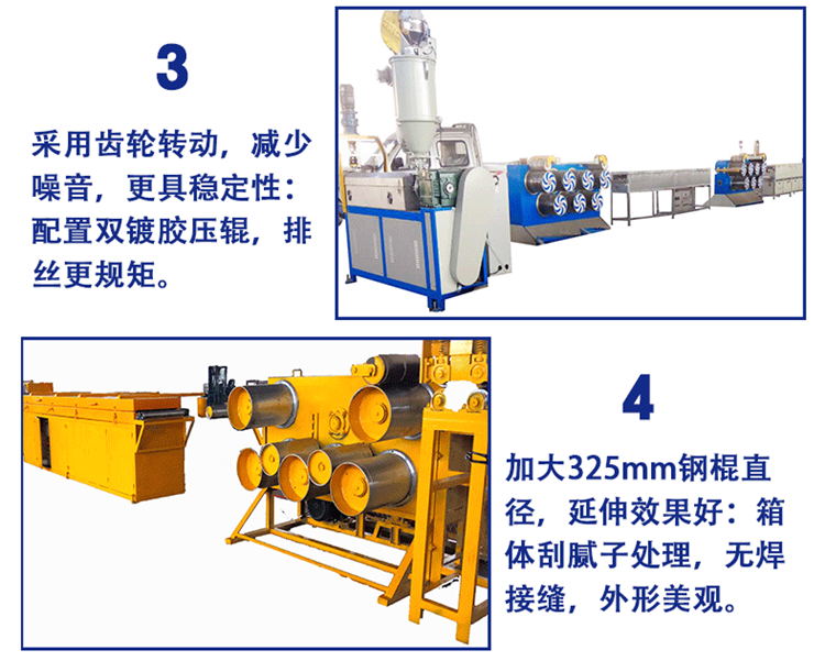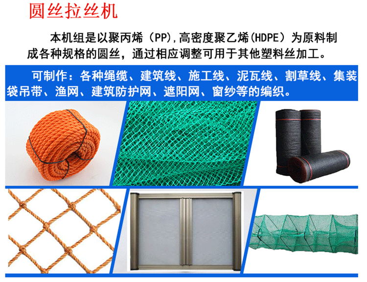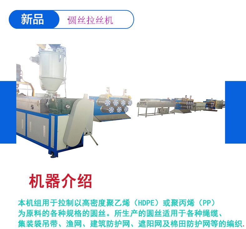 本機(jī)組是以聚丙烯(PP),聚乙烯(HDPE)為原料制成各種規(guī)格 的圓絲,通過(guò)相應(yīng)調(diào)整可用于其他塑料絲加工。