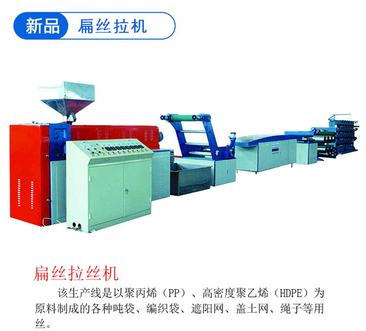 扁絲拉絲機(jī) 該生產(chǎn)線是以聚丙烯(PP)、聚乙烯(HDPE)為原料制成的各種噸袋、編織袋、遮陽網(wǎng)、蓋土網(wǎng)、繩子等用絲。